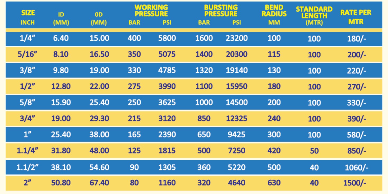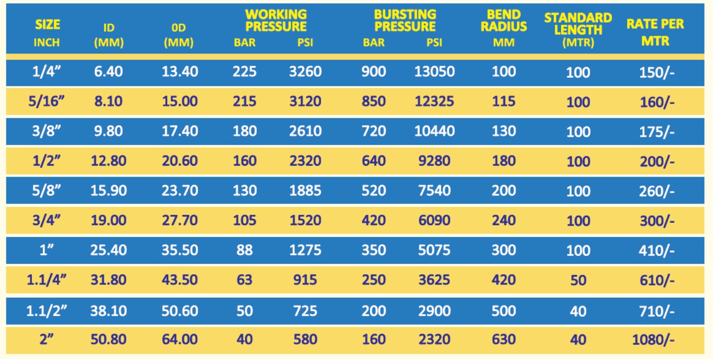 Standard Color: Inner tube Black Outer Cover Black Tube: Black, Oil-Resistant Synthetic rubber (NBR) Cover: Wrap & Smooth – Black, Oil and abrasion resistant synthetic rubber Reinforcement:
